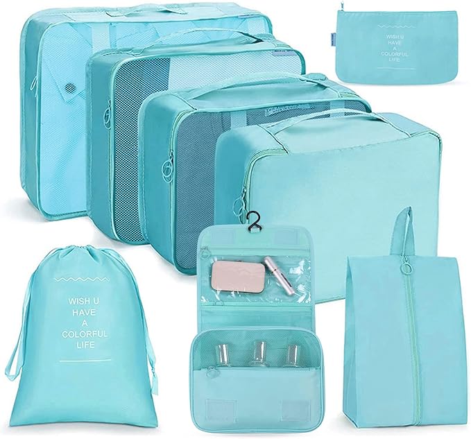 - Zestaw 8 sztuk: W skład wchodzi 3 kostki do pakowania z przezroczystą siatką, 1 kosmetyczka, torba na buty oraz 3 dodatkowe organizery.