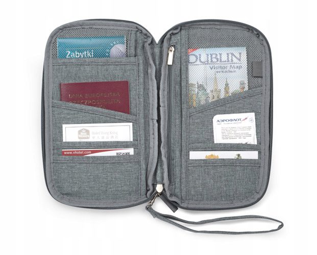 - Posiada liczne przegródki na bilety, karty pokładowe i paszport